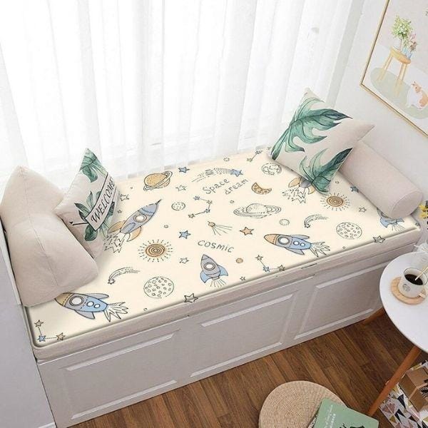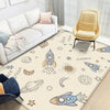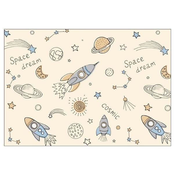 ベージュ色の背景にロケットや航空宇宙のモチーフをあしらった子供用プレイマットは、さまざまな色やインテリアに調和します。リビングルームにも子供部屋にも設置できます。