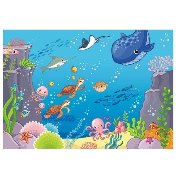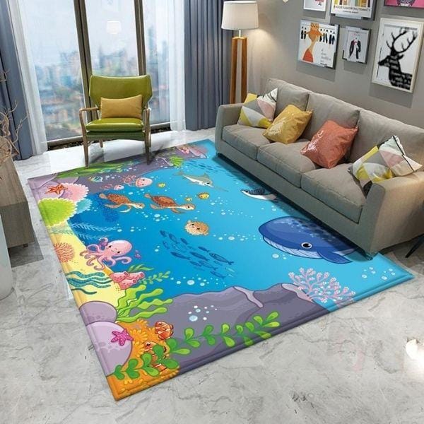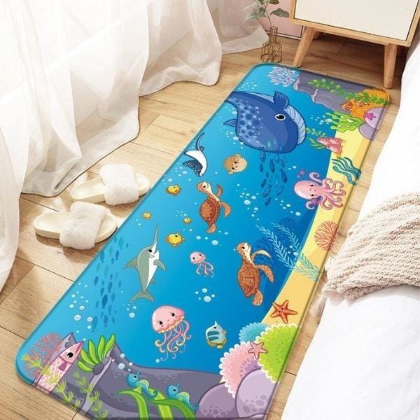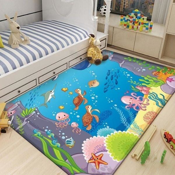 高品質な子供部屋用、とても可愛い海をテーマにしたプレイマットは、青い海を背景に、カメ、タコ、クジラなどの可愛いイラストが描かれており、海の深みに誘います。