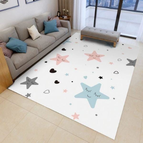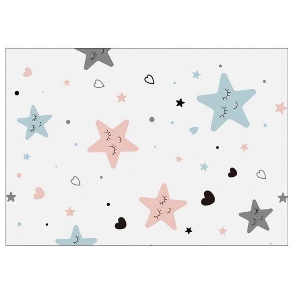 スタープレイマットは、主にピンクとブルーの星柄がプリントされた白いマットです。いくつかのサイズがあるよ、上で見てね。